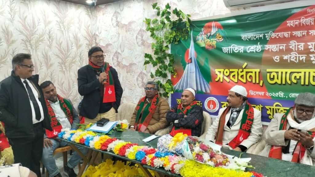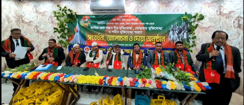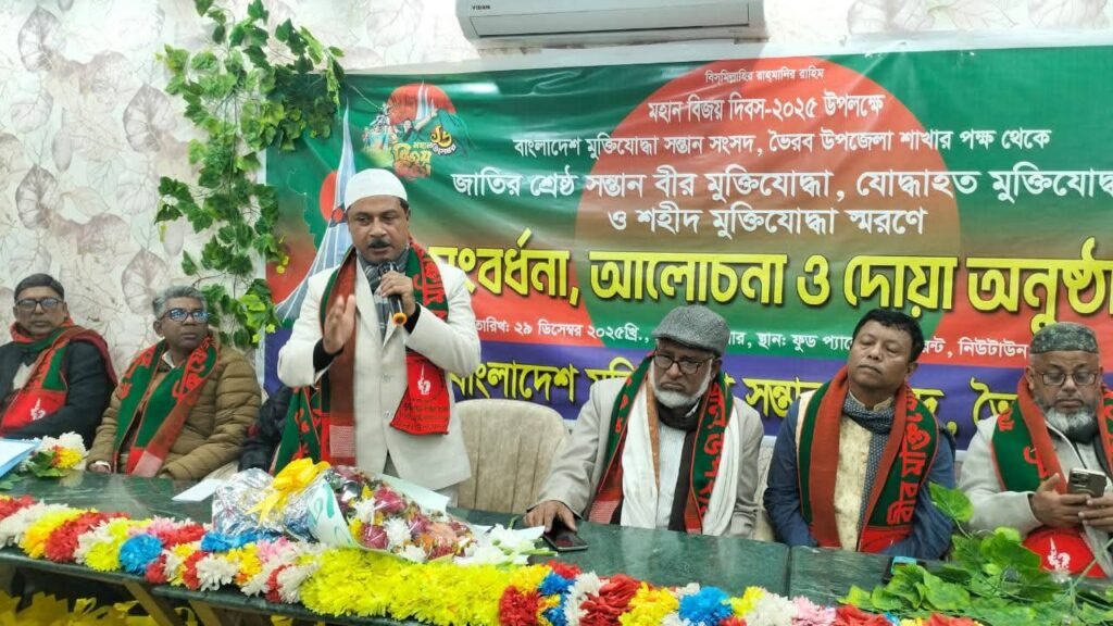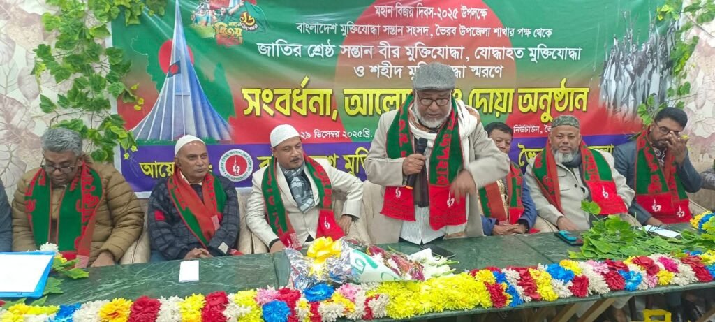 মহান বিজয় দিবস–২০২৫ উপলক্ষে বাংলাদেশ মুক্তিযোদ্ধা সন্তান সংসদ, ভৈরব উপজেলা শাখার উদ্যোগে জাতির শ্রেষ্ঠ সন্তান বীর মুক্তিযোদ্ধা, যোদ্ধাহত মুক্তিযোদ্ধা ও শহীদ মুক্তিযোদ্ধাদের স্মরণে এক সংবর্ধনা, আলোচনা সভা ও দোয়া অনুষ্ঠান অনুষ্ঠিত হয়েছে।